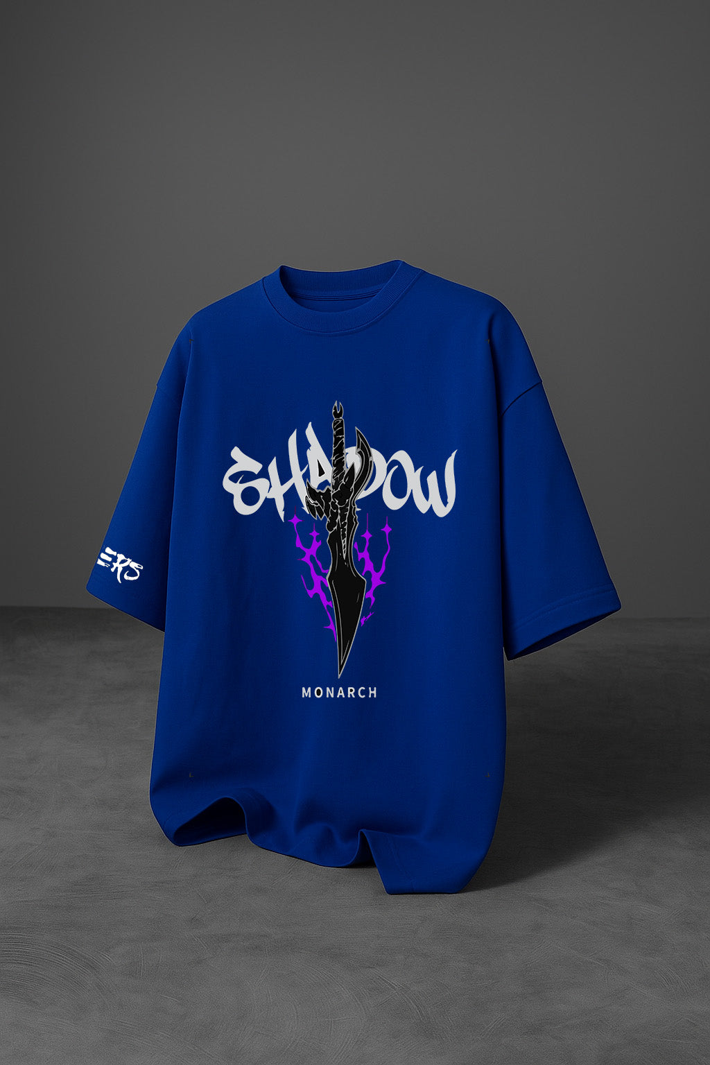 Crafted from breathable 220 GSM premium cotton, the tee features a bold, back print of a solitary silhouette wielding a cursed blade and shrouded in violet flame. The front? It screams Shadow in ink-styled graffiti flanked by the Monarch’s signature dagger—a reminder that power often walks alone.